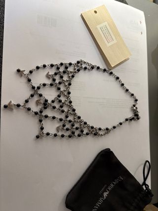 Elegante collar de Emporio Armani con un diseño único. - Cadena fina con cuentas negras. - Detalle de apliques plateados en forma de águila. - Cierre de mosquetón.