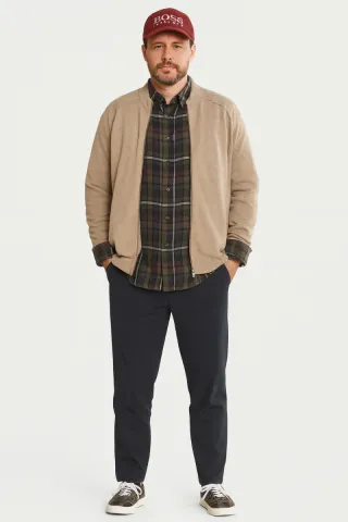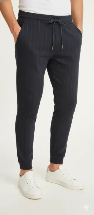 Pantalón para hombre con un diseño elegante a rayas. Corte ajustado. Cintura con cordón de 50 cm. Largo 103 cm Bolsillos laterales. 90% algodón, 10% poliéster. Massimo Dutti.