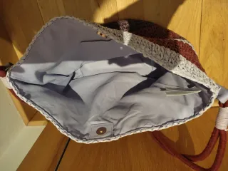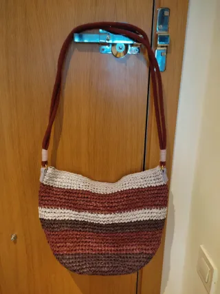 Bolso de rafia con un diseño de rayas en varios tonos. - Material: Rafia - Diseño: Rayas horizontales - Cierre: Sin cierre visible - Asas: Cuerda de tela - Forma: Media luna