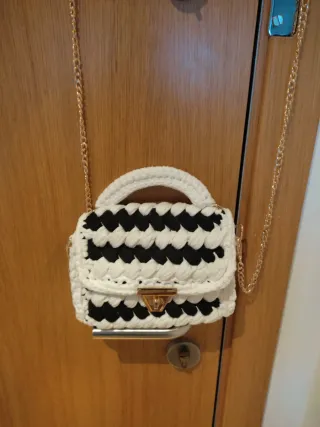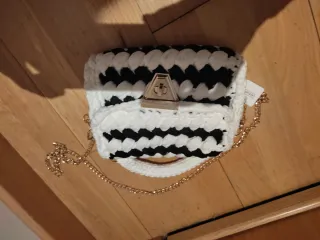 Bolso de mano con un diseño llamativo en blanco y negro. Cuenta con un asa superior y una cadena dorada para llevarlo cruzado. - Cierre metálico dorado. - Diseño de escamas en blanco y negro.