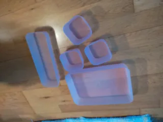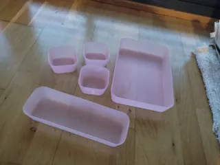 Set de recipientes para organizar cosméticos. - Incluye un recipiente alargado y cuatro recipientes cuadrados. - Color rosa translúcido.