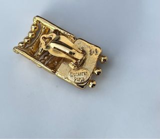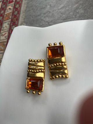 Elegantes pendientes clip de la marca Jean-Louis Scherrer. - Diseño rectangular con detalles dorados. - Acentos de piedra en tono ámbar. - Estilo vintage.