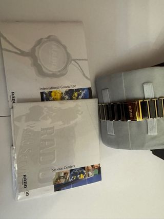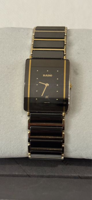 Elegante reloj Rado con un diseño rectangular. - Caja y pulsera de cerámica negra. - Detalles en tono dorado. - Esfera negra con marcadores dorados.