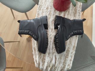 Botas estilo militar en color negro, talla 36. Han sido usadas una sola vez. - Diseño con cremallera lateral. - Suela gruesa y robusta. - Detalle de ojales metálicos. -Sin la caja original.