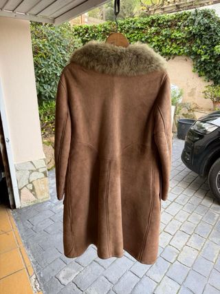 Elegante chaquetón largo de ante con un cálido forro interior y un distintivo cuello de pelo. - Cierre de botones. - Dos bolsillos frontales con solapa. - Diseño clásico y atemporal.