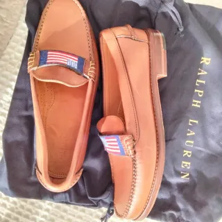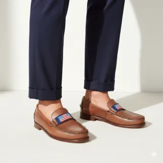 Mocasines de cuero marrón con un detalle distintivo. - Diseño de mocasín clásico. - Tira decorativa con diseño de bandera americana.