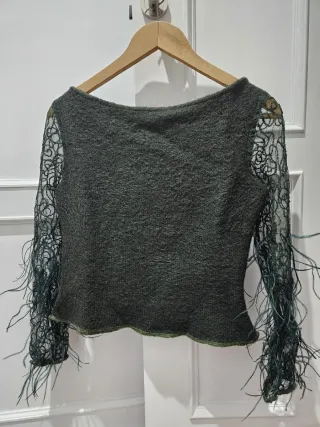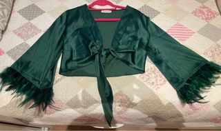 Camisa elegante en color verde oscuro con acabado satinado. Diseño original con lazada frontal ajustable y mangas largas acampanadas rematadas con plumas, que le dan un toque sofisticado y llamativo. Ideal para ocasiones especiales, eventos o looks de noche.