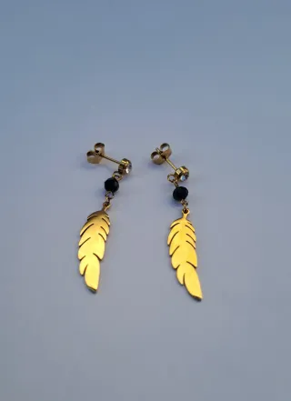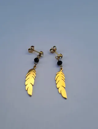 Elegantes pendientes largos con diseño de pluma. - Acero inoxidable con acabado dorado. - Detalle de cuenta negra y cristal.