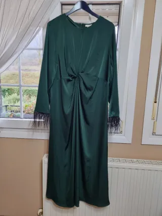 Elegante vestido largo de manga larga en un llamativo tono verde. El diseño presenta un detalle de nudo en la cintura y un toque sofisticado con adornos de plumas en los puños. - Color: Verde - Manga larga - Detalle de nudo - Puños con plumas