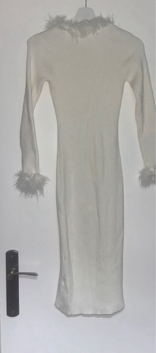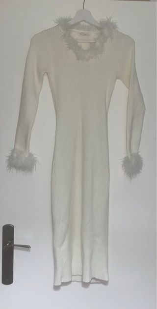 Vestido de punto blanco con detalles de plumas. - Diseño ajustado. - Mangas largas. - Adornos de plumas en cuello y puños.