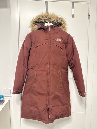 Relleno Plumas de Ganso.. Abrigo largo The North Face en color rojo, ideal para el frío. - Capucha con pelo. - Cierre de cremallera. - Bolsillos frontales con cremallera.