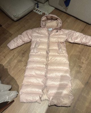 Abrigo largo acolchado de la marca Nike. Es una prenda muy cálida y estilosa. Tiene un color precioso rosado perla claro.super caliente, muchas plumas y no pesa nada Es una S grande - Diseño largo hasta los tobillos. - Capucha integrada. - Cierre de cremallera frontal. - Bolsillos laterales.
