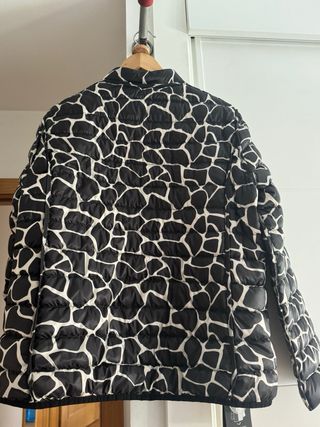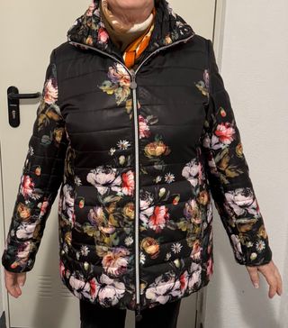 Chaqueta acolchada con un llamativo estampado floral sobre fondo negro. Un diseño vibrante y elegante. Apenas usado, no acertaron con la talla y me está muy ajustado. - Cuello drapeado. - Cierre de cremallera frontal. - Cuello alto. - Mangas largas. - Talla pequeño, casi es una 44