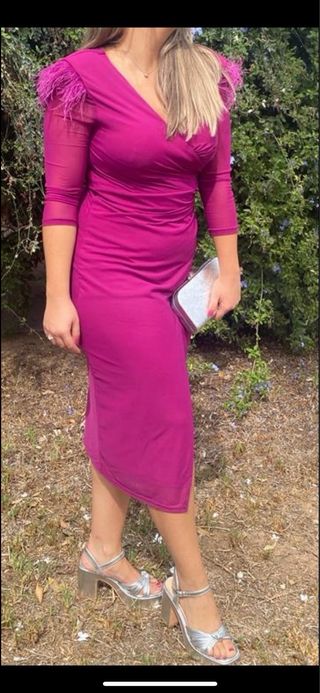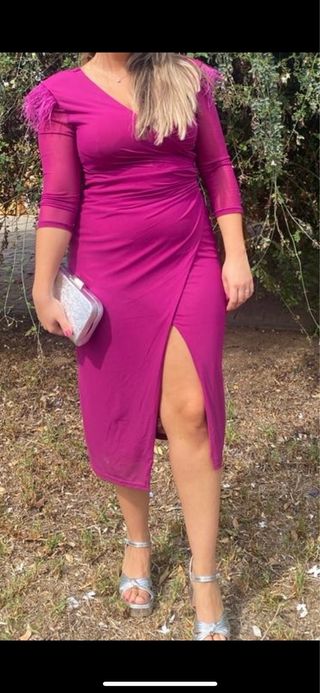 Elegante vestido de fiesta en tono rosa vibrante, ideal para eventos especiales. Diseñado con un favorecedor escote cruzado y una abertura lateral. - Mangas largas de tul con detalle de plumas en los hombros. - Corte drapeado en la cintura. - Incluye un bolso de mano plateado a juego. - Sandalias plateadas de tacón con tiras.