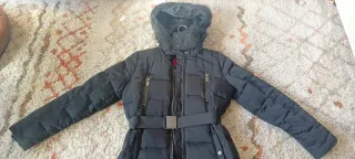 Abrigo largo de plumas para mujer. - Diseño acolchado y muy caliente. - Cinturón con hebilla en perfecto estado. - Capucha con pelo. - Bolsillos con cremallera. - La tela de los bolsillos es de forro polar muy calentita también. - Los bolsillos del pecho tienen la tela alrededor de la cremallera desgastada, todo lo demás está en perfectas condiciones. Vendo por falta de uso (me queda un poco largo).
