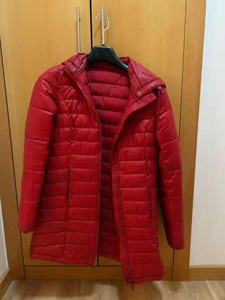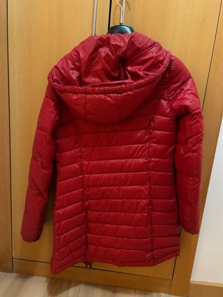 Plumífero de chica roja (50% plumón/50% plumas), súper ligero y calentito, cierre con cremallera, dos bolsillos, puños ajustados. Talla M escasa, como S, corte entallado, medidas 48 cm de sisa a sisa y 59 de largo. Impecable, en perfecto estado (único desgaste en el tirador de la cremallera según foto)
