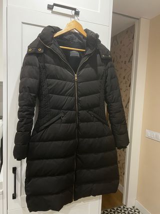 Plumífero largo con capucha de Zara. Es resistente al agua y al viento. - Diseño acolchado con plumas - Cierre de cremallera. De esta temporada . Me he equivocado de talla y se me ha pasado el ticket de devolución . En la web tiene en precio que me costo , sin descuento