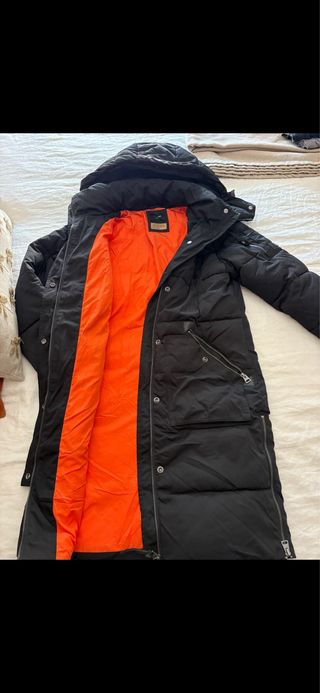 Abrigo plumas largo mujer GARCIA, talla XS, con capucha, ajustable a cintura, cierre con cremallera y botones, bolsillos exteriores con cremallera y bolsillo interior. Prácticamente nuevo, usado un par de veces.