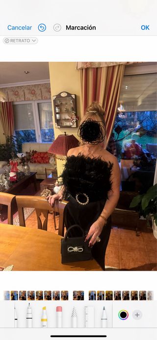 Bolso pequeño para fiestas y ceremonias. Terciopelo negro. Adorno de plumas. Doble asa corta. Asa larga de cuerda que se puede dejar en el interior del bolso. Cierre metálico de imán en color dorado. Cremallera interior . Base con 4 apoyos metálicos en dorado. Utilizado en una ocasión, está impecable.