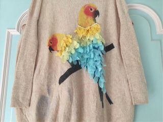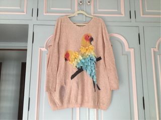 Jersey de punto fino con un diseño de dos loros bordados y con apliques de tela. - Cuello redondo. - Manga larga. - Detalle de perlas en el cuello de los pájaros. - Colores vibrantes en los apliques de las plumas.