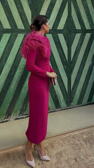 Vestido fucsia con plumas y mangas de tul