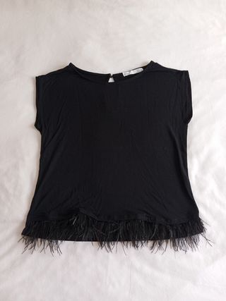 Camiseta negra con un detalle de plumas en el bajo. - Manga corta. - Cierre en la nuca. - Bajo con plumas.