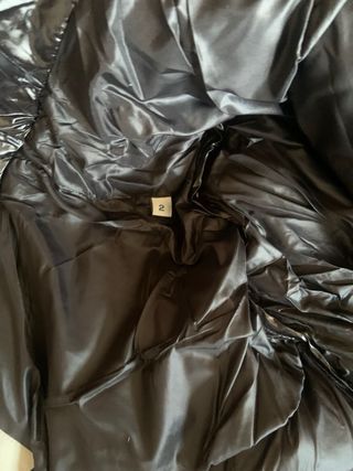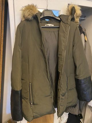plumas caqui, con parte baja de la manga de polipiel. Capucha con pelo, se puede extraer ya que tiene cremallera. Bolsillos laterales con cremallera tambien. Es super caliente, y està como nuevo, me costó 100€ en rebajas de hace dos años en easy wear, puesto solo 1 vez. Tiene la cremallera rota de ahi su precio.