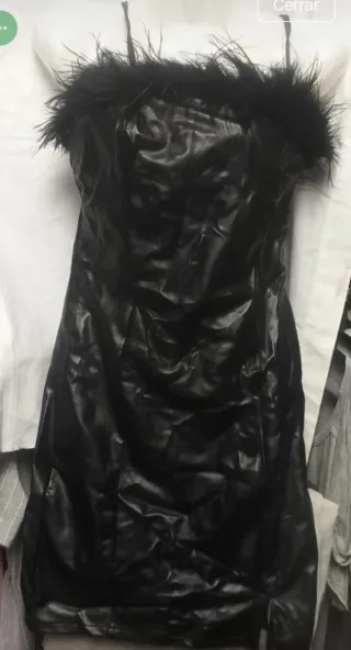 No tiene etiqueta lo compre en una tienda vintage. Es una M o una S grande .Vestido vintage con un toque glamuroso. - Tejido de terciopelo. - Tirantes con detalle de cadena. - Adorno de plumas en el bajo.