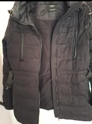 Plumas talla M Mango con capucha. Con bolsillos con cremallera y doble bolsillo sin ella con forro polar por dentro. Relleno de plumas de pato gris. Largo a medio muslo con cremalleras laterales. Abriga muchísimo.