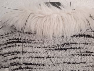 Abrigo largo de invierno, (1,30m aprox), entallado, talla 38 y precioso estampado en blanco roto y negro. Con cuello en pelo y plumas, bolsillos laterales, 6 botones y enganche para subir y cerrar el cuello. Interior en suave pelo color negro, muy agradable al tacto y muy confortable y cómodo.