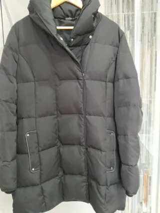 Abrigo de plumas de Zara, negro, muy calentito. Talla XS El cuello de pelo se puede quitar. Tiene cordones ajustables en la cintura.