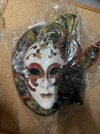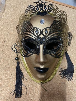 Elegante máscara veneciana con detalles en brocado. Dispongo de más unidades y diferentes modelos. Posibilidad de combinar varios packs o hacer lotes más grandes para eventos, fiestas o decoración de locales. Preguntar sin compromiso. - Diseño intrincado en negro y dorado. - Adornos rojos y plumas negras. - Ideal para disfraces o decoración.