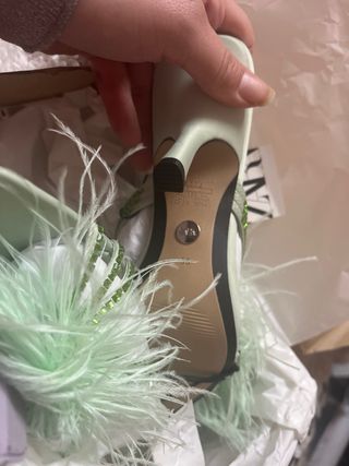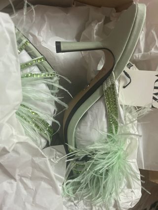 Elegantes tacones de Zara con un diseño llamativo. - Tira delantera adornada con pedrería. - Detalle de plumas en la parte delantera. - Tacón fino y alto.