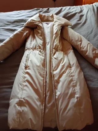 Abrigo acolchado de Zara en color blanco roto, perfecto para el frío. Mu abrigadito Talla S, oversize. Para M o L pequeña. 83 de largo - 54 de ancho. Con corchetes y cremallera. - Diseño moderno y confortable. - Cierre de botones a presión. - Capucha integrada.