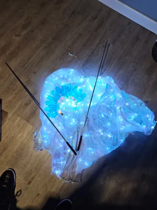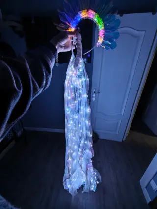 Conjunto de capa y diadema para novios, con un diseño único y luminoso. Se usaron en la hora loca de nuestra boda. - Capa larga con detalles de luces LED integradas. - Diadema decorada con elementos iridiscentes y luces de colores. - Diadema INDIO con plumas