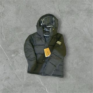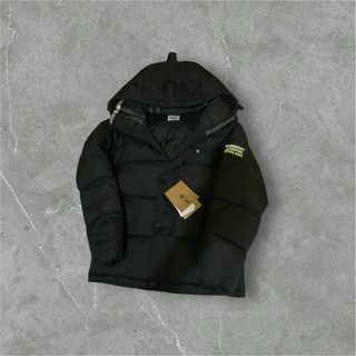 Abrigo de plumas con capucha y detalles de cuadros. - Cierre frontal con botones. - Bolsillos laterales. - Logo de Burberry en la manga.
