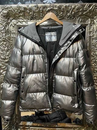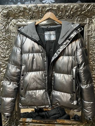 Chaqueta de plumas con un diseño acolchado moderno y capucha. - Color gris metalizado. - Cierre de cremallera frontal. - Bolsillos laterales con cremallera. Bolsa para guardar