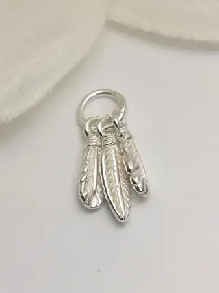 Primorosas y originales mini plumas de 0.80 cm de alto por 0.40 cm de ancho cada una, en colgante y genuina plata de ley 925. La arandela mide 0.60 cm de diámetro.