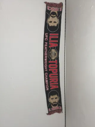 Bufanda conmemorativa de Ilia Topuria, campeón de peso pluma de UFC. SOLO QUEDAN 3 UNIDADES SE AN VENDIDO TODAS LAS DEMAS - Diseño con retratos de Ilia Topuria. - Texto EL MATADOR y UFC FEATHERWEIGHT CHAMPION. - Logo de UFC. SE ACEPTAN CAMBIOS