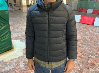 Chaqueta de plumas de pato naturales con un diseño acolchado. Dos bolsillos laterales con cremallera y otro interior. Al ser de pluma abriga bastante. Usada pero en buen estado. Único desperfecto el descosido en la manga que se ve en una de las fotos.