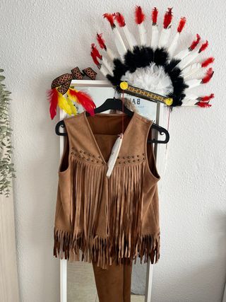 Disfraz de estilo indio para mujer. - Chaleco de antelina con flecos y tachuelas marca local talla L. Es abierto pero yo lo cerré con imperdibles para ponérmelo sin nada debajo. - Pantalón de antelina marca Springfield tallaL. - Incluye tocado de plumas. - Complementos elásticos incluidos: brazaletes de cinta con plumas para los brazos y pulseras de cinta para las muñecas. Pantalón