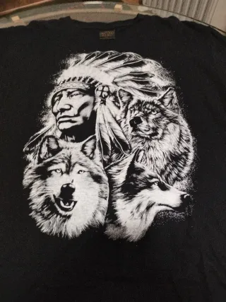 Camiseta con un llamativo diseño en blanco y negro.unisex ,aunque ponga xxxl es una xl - Ilustración de un indio con tocado de plumas. - Incluye retratos de lobos. - Estampado frontal.