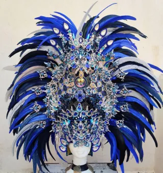 Este impresionante casco de carnaval está diseñado, decorado y adornado con detalles intrincados y hechos a mano artesanalmente y plumas vibrantes y muy llamativas. - Medidas: 80cmx85cm (aprox). - Peso: 3.5 kg - Diseño elaborado con pedrería, piezas con estilo barroco realizadas y decoradas una a una con pedrería también, todas las piezas son artesanas y realizas por mi. - Plumas en tonos azules, grisáceos y negros. - Adornos plateados, dorados e inspirados en motivos del barroco. PVP negociable