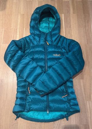 Chaqueta de plumas Rab Electron Pro para mujer. - Color azul verdoso. - Capucha integrada. - Cremallera frontal. - Bolsillos laterales con cremallera. Nuevo sin etiquetas