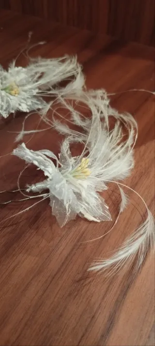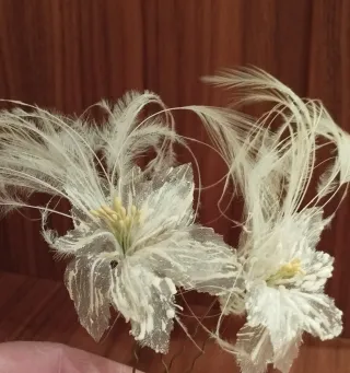 Elegantes horquillas decorativas, perfectas para complementar recogidos y peinados. - Diseño floral con plumas blancas. - Detalles plateados y blancos.