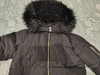 Abrigo acolchado de mujer con capucha de pelo. Talla S oversize, da más talla. Plumas, tejido ligeramente impermeable Capucha desmontable con accesorio de pelito también desmontable. Pequeño descosido en la parte baja interior, no se ve, no afecta a su función. - Cierre de cremallera frontal. - Bolsillos laterales con cremallera. - Puños con detalle de cremallera.