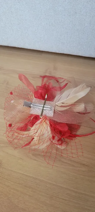 Elegante tocado adornado con flores y detalles de velo. - Diseño floral con pétalos en tonos rojos y crema. - Incorpora una delicada red de velo. - Adornado con plumas finas.