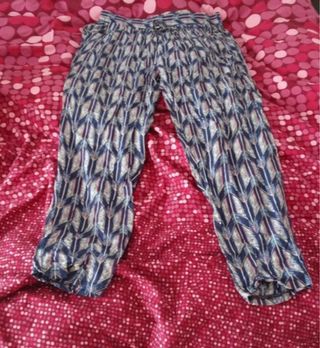 Pantalón con un diseño llamativo y moderno. - Estampado de plumas en tonos azules y rojos. - Cintura con cordón ajustable.