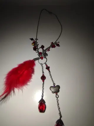 Bonito colgante con detalles en forma de pluma y mariposa. - Colgante con cadena. - Detalle de pluma roja. - Adorno de mariposa. - Cristales rojos.