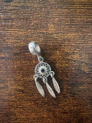 Este colgante tiene un diseño inspirado en un atrapasueños con detalles de plumas. Tipo de joya: Colgante de atrapasueños Peso aproximado de la joya: 1,8 g Piedras: Circonita azul Hipoalergénico: Sí - Colgante con forma de atrapasueños. - Tres plumas colgantes. - Detalle central oscuro.